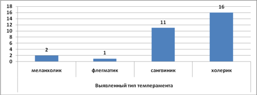 Данные диагностики показывают, что 16 подростков (53%) имеют тип темперамента "холерик". Это сильные, подвижные, неуравновешенные подростки. Отличаются большой силой, отвагой, предприимчивостью, доминированием в общественной деятельности. Эти подростки способны эффективно работать в условиях риска; соревнования, трудности активизируют на их преодоление. Общительны, имеют широкий круг друзей и знакомых, стремятся к лидерству, с удовольствием берут на себя решения проблем других людей, ответственность. В борьбе упорны, настойчивы, не боятся сильного противника. Чрезвычайно ценят признание их заслуг окружающими. В обучении стремятся к признанию, лидерству. Учатся не всегда ровно, часто отношение к предмету зависит от отношений с преподавателем, для успеха в обучении важна конкуренция, эмоциональность, разнообразие учебного материала. На уроке не всегда дисциплинированы, но быстрее остальных усваивают, соображают, запоминают; ориентированы на все новое, необычное.