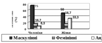 У цілому ж жіноча група демонструє маскулінні риси значно виразніше ніж чоловіки демонструють - фемінінні риси. У загальній групі маскулінних жінок - 32%. Серед одружених їх 50%, серед неодружених - 15,4%. Особливо високий показник у жінок по андрогінному типі: в загальній групі - 44%, серед одружених - 33,3%, неодружених - 53,8%. Можна зробити проміжний висновок, що неодруженим жінкам характерна андрогінна гендерна ідентифікація.