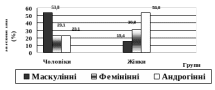 Цікаво, що в нашому випадку серед чоловіків у загальній групі - 20% (кожен п'ятий) має риси фемінінності, тобто жіночності. У групі неодружених їх трохи більше - 23,1%, чим у групі одружених - 16,7%. Андрогінность у групі чоловіків склала в цілому - 16%, що значно менше, ніж у групі жінок - 44%.