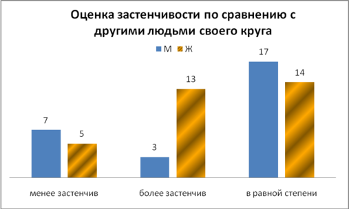 Согласно рисунку 4, большинство мужчин считают, что застенчивы, как и все остальные люди своего круга (17 человек из 27) – 60 %. При этом схожее мнение имеют только 44 % женщин (14 человек из 32); 41 % женщин (13 человек из 32) думают, что они более застенчивы по сравнению с другими. При этом только 11 % (3 человека) мужчин думают аналогично.