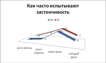 При ответе на вопрос № 4 - 47% женщин и 55% мужчин ответили, что испытывают застенчивость часто, почти через день. На рисунке 3 приведен график распределения частоты ответов на вопрос № 4.