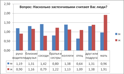 На рисунке 11 видно, что М предполагают, что их считают застенчивыми коллеги, соседи, в то время как Ж предполагают, что застенчивыми их считают мать, подруга или друг, братья или сестры. Необходимо отметить, что влияние родственников (матери, отца, братьев и сестер) намного выше для женщин, чем на мужчин. При этом для мужчин наиболее важно мнение коллег, соседей, близких друзей и руководителей.