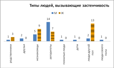 Различие заметно в выборе типов людей, вызывающих застенчивость у М и Ж на уровне значимости 0,05(