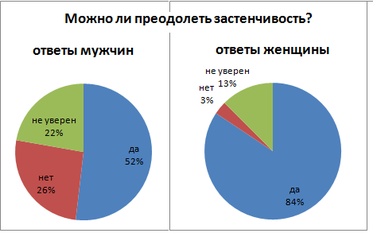 ). На рисунке 9 показано, что 84 % женщин считают преодоление застенчивости возможным и только 52 % мужчин поддерживают данное мнение. При этом 22 % мужчин думают, что застенчивость невозможно преодолеть.