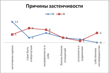 Для мужчин основная причина застенчивости - опасение негативной оценки со стороны других людей (13 человек из 27) – 48 %. Для женщин основная причина застенчивости - страх быть отвергнутым (9 человек из 32) - 28 %, недостаточная уверенность в себе (8 человек из 32) – 25 %, собственное несовершенство (6 человек из 32) – 19 %.