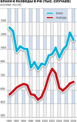 В настоящее время развод как явление оценивается неоднозначно. Если раньше его интерпретировали однозначно отрицательно - как угрозу семье, то сегодня возможность расторжения брака рассматривается как неотъемлемый компонент семейной системы, необходимый для реорганизации ее в тех случаях, когда сохранить семью в прежнем составе и структуре оказывается невозможным. Возрастание разводов, по мнению СИ.Голода, в определенном смысле предопределено переходом к новому способу заключения брака, когда основное значение приобретает свободный выбор супруга на основе чувства любви и личностной избирательности [15, с.126]. По мнению автора, свобода выбора партнера с необходимостью предполагает свободное расторжение брака в условиях, когда супружеские отношения складываются неудачно. Развитие экономической самостоятельности и социального равноправия женщин создает условия для расторжения брака в тех случаях, когда семья становится помехой на пути свободного саморазвития и самореализации женщины. Отсюда, как видим, количество разводов за последнее время неуклонно растет (рис. 1).