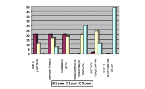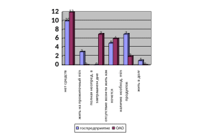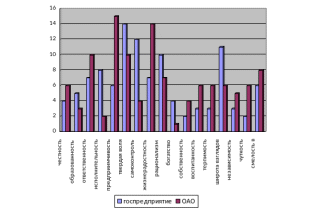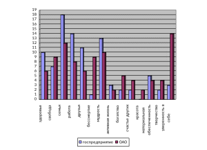 Так, сотрудники коммерческой организации придают большее значение деньгам, более высоко оценивают свои возможности в повышении собственных доходов, имеют более высокий уровень желания быть собственником и хуже относятся к богатым по сравнению с сотрудниками государственного предприятия. Применяя критерий хи-квадрат (приложение 6) были выявлены следующие различия в представлениях о богатстве и бедности у сотрудников ОАО и государственного предприятия, а так же в ценностях для жизни и решении проблем.