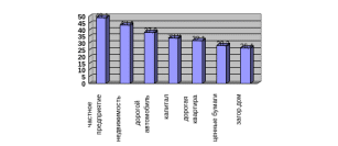 Из рисунка мы видим, что в представлениях респондентов большинство окружающих людей хотели бы владеть частным предприятием и недвижимостью, чуть меньше были выбраны дорогие автомобили, капитал, квартира и ценные бумаги.