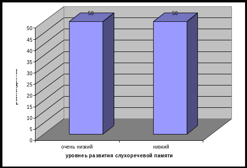 Итак, на констатирующем этапе исследования по результатам диагностики долговременной слуховой памяти дошкольников с ОНР III уровня по методике А.Р. Лурия было выявлено 50% дошкольников с очень низким уровнем развития слуховой долговременной памяти, 50% - с низким. См. гистограмму 2.