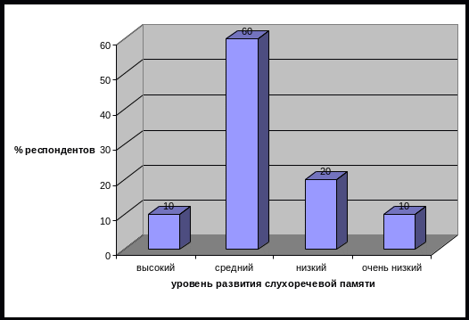 Итак, констатирующий эксперимент показал, что среди дошкольников с ОНР III уровня 10% детей имеют очень низкий уровень развития смысловой слухоречевой памяти, 50% - низкий, 40% - средний. См. гистограмму 3.