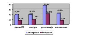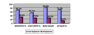 Для групи досліджуваних, що мають високий рівень суб’єктивного контролю, тобто інтерналів, характерні наступні показники вираженності негативних психічних станів: стан тривожності характерний для 32,4%, агресивності -27,5%, фрустрації – 26,5%, ригідності – 12,3% досліджуваних.