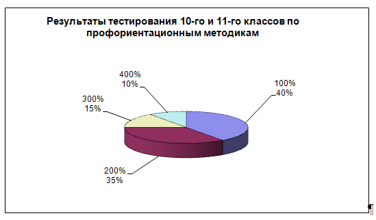 Результаты тестирования 10-го и 11-го классов по профориентационным методикам: 1 – 40% учеников в большей степени предрасположены к точным техническим специальностям; 2 – 35% учеников в значительной степени предрасположены к техническим специальностям; 3 – 15% учеников с неопределенной профессиональной предрасположенностью; 4 – 10% учеников не предрасположены к выбору техническим специальностям.