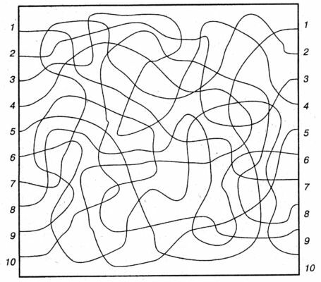 Описание: ребенку предлагается рисунок с переплетенными линиями. Начало каждой линии имеет номер слева, а концы линий пронумерованы справа. Номера начала и конца одной и той же линии не совпадают. Ребенку следует проследить по порядку все линии глазами, без помощи рук, и найти конец каждой линии. При этом вслух называть номер начала линии и ее конца. Необходимо фиксировать время, затраченное на весь тест, а также остановки, ошибки. На все задание отводится не более четырех минут.