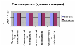 Итак, мужская выборка представлена 30 испытуемыми с доминирующим холерическим типом темперамента, 30 - с сангвиническим, 30 - с флегматическим и 30 - с меланхолическим. По выборке женщин: 30 испытуемых в качестве доминирующего имеют холерический тип темперамента, 30 - сангвинический, 30 - флегматический и 30 - меланхолический. Таким образом, в исследовании принимали участие 240 испытуемых, состоящих в браке, среди которых 60 респондентов (по 30 мужчин и 30 женщин) с доминирующим холерическим типом темперамента, 60 - с сангвиническим, 60 - с флегматическим и 60 - с меланхолическим.