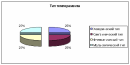 Как видно из данной круговой диаграммы, вся выборочная совокупность (100%) представлена равным количеством испытуемых с одним их доминирующих типов темперамента: по 25% испытуемых на каждый из 4-х типов темперамента.