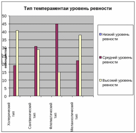 Рис.2.5 Тип темперамента и уровень ревности у лиц, состоящих в браке (N=240)