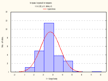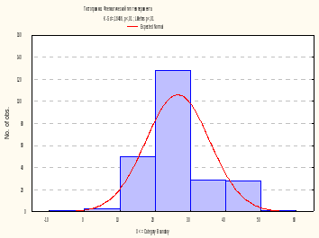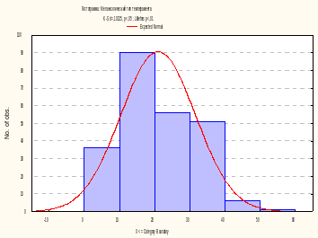 Визуальный анализ графика-гистограммы позволяет заключить, что распределение значений переменной Сангвинический тип темперамента отличается от нормального. Более того, уровни значимости р по критерию Колмогорова-Смирнова с поправкой Лиллиефорса также не отвечают требованию нормального распределения (р<0,01, р<0,01).