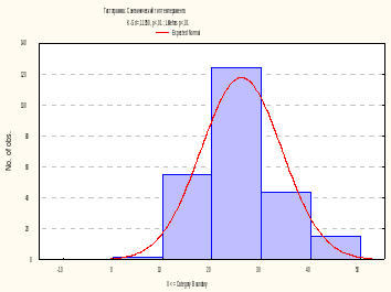 Визуальный анализ графика-гистограммы позволяет заключить, что распределение значений переменной Меланхолический тип темперамента отличается от нормального. Более того, уровни значимости р по критерию Колмогорова-Смирнова с поправкой Лиллиефорса также не отвечают требованию нормального распределения (р<0,05, р<0,01).