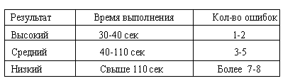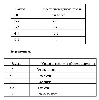 Фиксируемые параметры: t – время выполнения; N –количество правильно воспроизведенных точек. Объем внимания оценивается по 10-бальной системе: