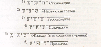 Над каждой буквой поставьте ту цифру, которую вы обвели, прочитав утверждение, отмеченное этой буквой. Сложите цифры и результаты запишите над причиной, соответствующей утверждению. Психологи выделяют шесть наиболее распространенных мотивов курения.