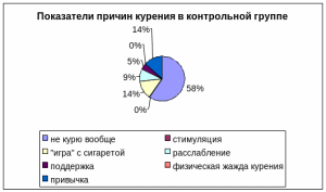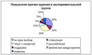 самый высокий показатель причин курения был выявлен «игра с сигаретой» - 6 человек в экспериментальной группе и 3 человека в контрольной группе.