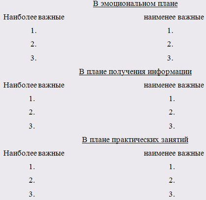Выразите степень значимости (важности) для Вас предложенных понятий в эмоциональном плане, в плане получения информации и в плане практических занятий. Для этого выберите три наиболее важных и три наименее важных понятия из предлагаемого списка.