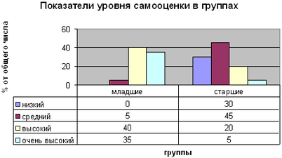 Рисунок 1 наглядно показывает различия в показателях у младших и старших подростков, а именно: младшие подростки менее критичны к себе, большинство их них обладает недостаточным самоконтролем, неспособностью держаться принятой линии поведения, зависимостью от внешних обстоятельств и оценок, они более импульсивны. Старшие же подростки, в большинстве своём, критичны по отношению к самому себе, не удовлетворены собственным поведением, уровнем достижений, особенностями личности, у них недостаточный уровень принятия самого себя.
