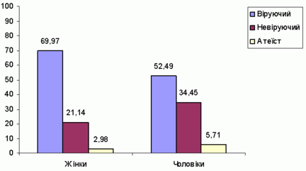 Аналогiчною до типу поселення є ситуацiя зi статевою зумовленiстю рiвня релiгiйностi. Як показують результати опитування, релiгiйнiсть жiнок є бiльшою вiд релiгiйностi чоловiкiв - 70% жiнок проти 50% чоловiкiв. Такий стан теж можна пояснити психофiзiологiчними та ментальними особливостями представникiв рiзної статi. Жiнки, як правило, є бiльш емоцiйними, налаштованими на пiдтримку моралi, в українському варiантi жiнки також традицiйно є берегинями домашнього вогнища, що, вiдповiдно, виражається й у бiльшому ступенi їхньої релiгiйностi.