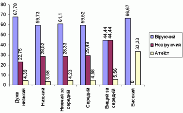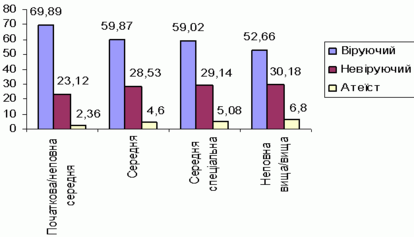 Як виявило опитування, високий освiтнiй рiвень негативно впливає на релiгiйнiсть, адже за освiтнiм критерiєм найвищий рiвень релiгiйностi в людей iз початковою або неповною середньою освiтою (70%), натомiсть найнижчий у людей iз вищою та незакiнченою вищою - заледве 53% . Проте, на наш погляд, не слiд виводити прямої залежностi цих двох показникiв. Найiмовiрнiше, на такому станi речей позначилася полiтика, яка велася Радянським Союзом у руслi комунiстичної iдеологiї, коли бiльшiсть людей iз вищою освiтою, як правило, мали бути комунiстами, а "комунiст" i "вiруючий" були поняттями несумiсними. Тобто релiгiйнiсть у середовищi високоосвiчених людей викорiнювалася цiлеспрямовано й через рiзного роду впливи.