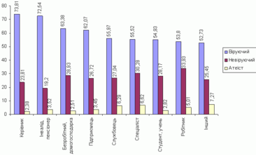 Релiгiйнiсть досить чiтко корелюється також iз родом занять (рис. 24). Данi двовимiрного аналiзу в цьому зрiзi, до речi, пiдтверджують уже наведенi вище результати та зробленi висновки. Зокрема, результати вказують на те, що найбiльше вiруючих серед керiвникiв (74%), тобто тих, хто впевнено почуває себе в життi. Так само високий рiвень релiгiйностi в середовищi iнвалiдiв та пенсiонерiв - 72,5%. Цю категорiю можна спiввiднести з такими категорiями з високим рiвнем релiгiйностi, як: 1) люди з низьким матерiальним станом; 2) люди старшого вiку. На третьому мiсцi за рiвнем релiгiйностi вiдповiдно до роду занять розташувалася така категорiя, як безробiтнi й домогосподарки (63%), серед яких за статевою ознакою переважають жiнки, якi характеризуються значно вищою релiгiйнiстю, нiж чоловiки, про що говорилося вище.