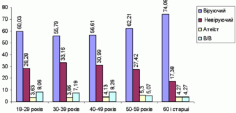 Однак якщо вiдзначенi вище результати та зробленi на їх основi висновки стали лише дослiдницьким пiдтвердженням загалом вiдомих тенденцiй, то данi, отриманi на основi двовимiрного аналiзу за iншими параметрами, дозволили вiдстежити зовсiм нез'ясованi досi залежності. Маємо на увазi, зокрема, вiковий критерiй у структурi та змiстовому наповненнi релiгiйностi. Як показують данi двовимiрного аналiзу, показники релiгiйностi серед респондентiв крайнiх вiкових груп ("18-29 рокiв" та "60 рокiв i старшi") є вищими, анiж показники релiгiйностi серед респондентiв середнього вiку. Це можна пояснити загальними тенденцiями стану релiгiї та церкви в українському суспiльствi протягом його повоєнної iсторiї: вищi показники релiгiйностi притаманнi тим вiковим середовищам, у яких вiра формувалася або в докомунiстичний, або в посткомунiстичний перiод [48; 15]. Слід зазначити, що процентне співвідношення молодих людей в протестантських общинах тотожний процентному співвідношенню осіб у вікових діапазонах 16-18 років і 29-30 років у складі населення України. У великих міських общинах процентне співвідношення молоді досягало 40%.