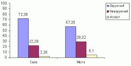 За результатами соцiологiчного дослiдження отримано емпiричне пiдтвердження значно вищого рiвня релiгiйностi в жителiв сiльської мiсцевостi порiвняно з мiським населенням: рiвень релiгiйностi на селi сягає 72%, тодi як у мiстi вiруючими себе вважають тiльки 57%.