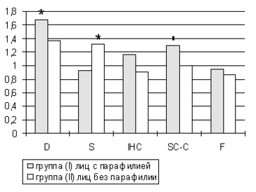 Так, в группе лиц с парафилией по сравнению с группой испытуемых без расстройств влечения преобладал показатель D, соответствующий правополушарным расстройствам (t" 0,04) и достоверно ниже был показатель недостаточности левополушарных факторов S (t" 0,04). На уровне тенденции было выявлено преобладание в I группе недостаточности субкортикально-кортикальных и межполушарных взаимодействий (соответственно t" 0,04 и t" 0,08 по одностороннему t-критерию).