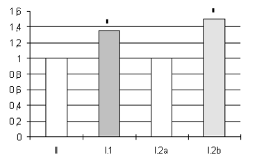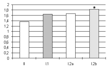 Рис. 5.3 Фактор D. Примечание: II - группа лиц без парафилии; I.1 - группа лиц с садизмом; I.2a - группа лиц с педофилией; I.2b - группа лиц с эксгибиционизмом.