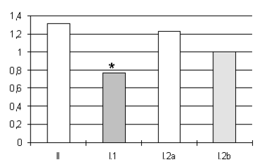 Рис. 5.4 Степень выраженности нарушений, характерных для дефицита левого полушария (Фактор S). Примечание: II - группа лиц без парафилии; I.1 - группа лиц с садизмом; I.2a - группа лиц с педофилией; I.2b - группа лиц с эксгибиционизмом.