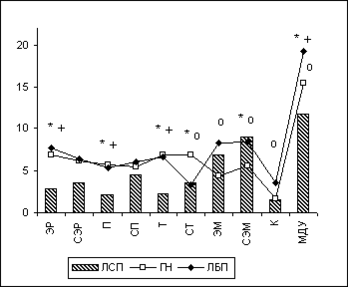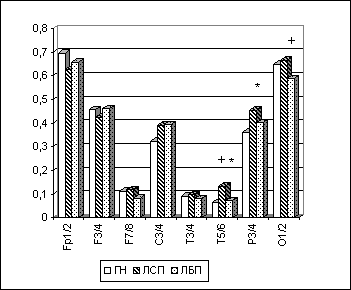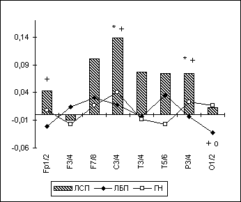 Примечания: Межгрупповые статистически достоверные различия (p<0.05 по LSD-тесту) в отдельных ЭЭГ-отведениях для пары "группа нормы-лица с парафилиями"(ГН-ЛСП) на рисунке обозначены звездочкой (*); для пары "группа нормы-лица без парафилий"(ГН-ЛБП) - кружком (о); для пары "лица с парафилиями- лица без парафилий" (ЛСП-ЛБП) - крестиком (+).