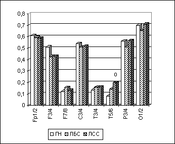 У обеих групп ЛСС и ЛБС наблюдалось снижение МКОГ по отношению к ГН в лобных и центральных регионах. Однако только у лиц с садизмом по сравнению с ГН отмечалось выраженное достоверное (p<0.05) повышение межполушарной когерентности в височных областях неокортекса в тета-, альфа- и бета-1-диапазонах ЭЭГ при различных функциональных состояниях (рис. 6.9). У лиц же с парафилиями без садистического компонента о повышении МКОГ можно говорить в основном как о тенденции (МКОГ достоверно выше относительно ГН в височных областях только в бета-диапазоне при открытых глазах).