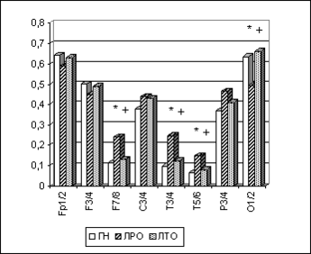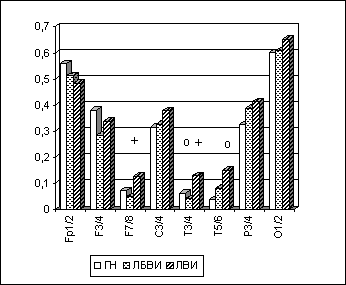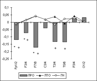 Примечания: Межгрупповые статистически достоверные различия (p<0.05 по LSD-тесту) в отдельных ЭЭГ-отведениях для пары "группа нормы-лица с резидуальным органическим поражением головного мозга"(ГН-ЛРО) на рисунке обозначены звездочкой (*); для пары "группа нормы-лица с текущим органическим поражением головного мозга"(ГН-ЛТО) - кружком (о); для пары "лица с резидуальным- лица с текущим органическим поражением головного мозга" (ЛРО-ЛТО) - крестиком (+).