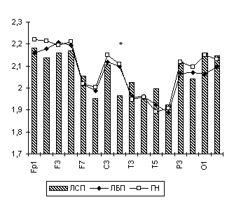 Примечания: На рисунке представлены значения индекса полушарной асимметрии (по ЛАСМ) в отдельных парах симметричных ЭЭГ-отведений ("ЛАСМ слева" минус "ЛАСМ справа"). Межгрупповые статистически достоверные различия обозначены так же, как на рис. 6.6.