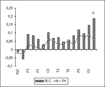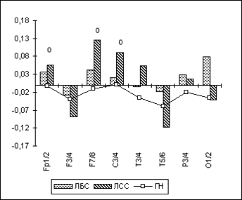 Примечания: Межгрупповые статистически достоверные различия (p<0.05 по LSD-тесту) в отдельных ЭЭГ-отведениях для пары "группа нормы-лица с садизмом"(ГН-ЛСС) обозначены кружком (о).