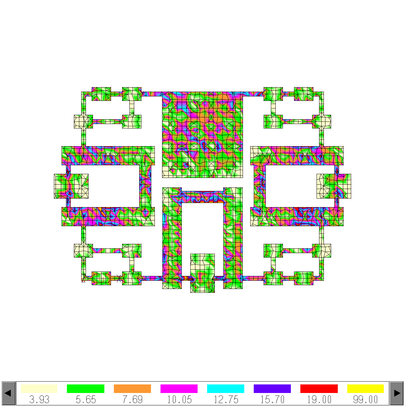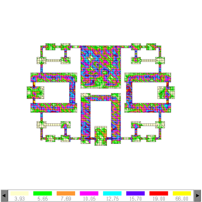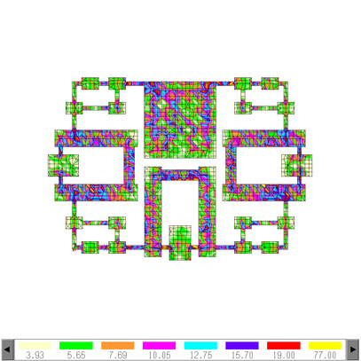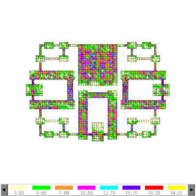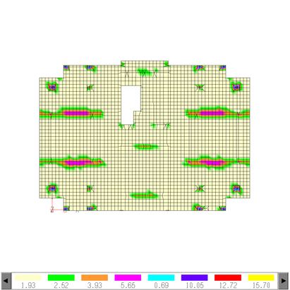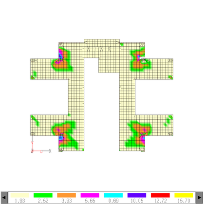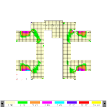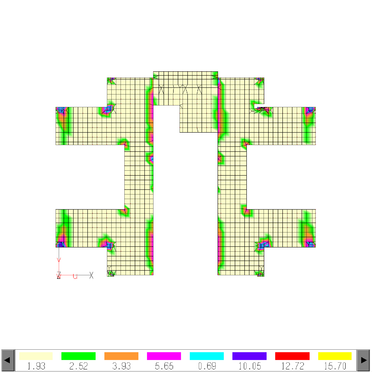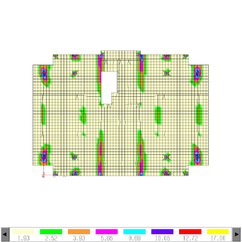 Колонны моделировались конечными элементами типа 3D-стержневой элемент. В модели реализована гипотеза «размазывания жесткости колонн», что позволило более полно смоделировать работу каркаса, т.е избежать завышенных пиковых значений армирования в местах сопряжения колонн с диском перекрытия.