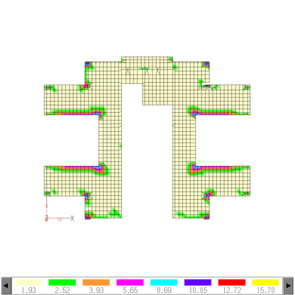 Покрытие, перекрытия, лестничные марши, лестничные площадки, а так же монолитные стены моделировались конечными элементами типа изгибно-плосконапряженный конечный элемент (элемент плоской оболочки).