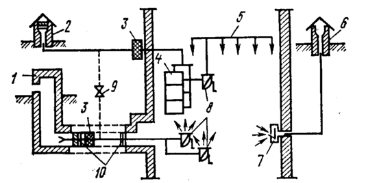 В фильтровентиляционной камере размещается фильтровентиляционный агрегат ФВА-49 (ФВК-1, ФВК-2), обеспечивающий вентиляцию помещений убежища и очистку наружного воздуха от радиоактивных, отравляющих веществ и бактериальных средств. На рис. показана принципиальная схема системы фильтровентиляции убежища малой вместимости: оголовок аварийного выхода 7; оголовок воздухозабора с клапаном-отсекателем 2; противопыльные фильтры 3; фильтры-поглотители 4; воздухоразводящаяя сеть 5;оголовок вытяжной системы 6, клапан избыточного давления 7;электроручные вентиляторы 8; герметический клапан 9; защитно-герметические стенки 10.