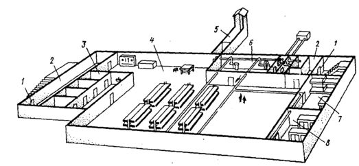 тамбуры, шлюзы 2, а к вспомогательным — фильтровентиляционные камеры 6, санитарные узлы 3, защищенные дизельные электростанции, входы 1 (тамбуры и предтамбуры) и выходы 5, медицинская комната 7, кладовая для продуктов 8. Помещения для размещения укрываемых рассчитываются на определенное количество людей: на одного человека предусматривается не менее 0,5 м2 площади пола и 1,5 м3 внутреннего объема. Высоту помещений убежищ принимают в соответствии с требованиями использования их в мирное время, но не менее 2,2 м от отметки пола до низа выступающих конструкций перекрытия (покрытия).