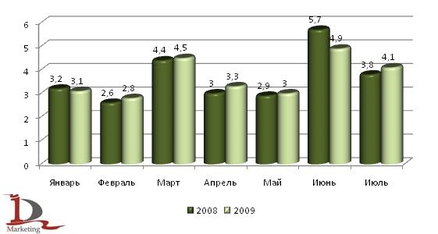 Кроме того, уменьшение объемов инвестиций и сохраняющийся недостаток заемных средств, при большой зависимости строительной отрасли от банков, отражаются на объемах строительных работ. Финансовые результаты чрезвычайно снизились – за первые пять месяцев года прибыль составила 13,1 млрд. рублей, что ниже результатов прошлого года более чем на 60%. Объем работ по виду деятельности «Строительство» в июле 2009г. остановился на отметке 357 млрд.рублей, что ниже прошлогоднего показателя на 17,8%. Несмотря на отрицательные сравнения с успешным 2008 годом – возрастающий тренд все-таки прослеживается с начала 2009 года в соответствии с сезонными тенденциями. Влияние кризиса не оказалось для строителей столь пагубным, как предсказывалось в 2008, однако, размер среднего отставания показателей объемов работ 2009 года в ежемесячном разрезе составил около 13%.
