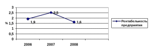 Показатель рентабельности продукции более полно, чем прибыль, характеризует окончательные результаты хозяйствования, потому что его величина показывает соотношение эффекта с наличными или использованными ресурсами. Рентабельность производственной деятельности (окупаемость издержек) исчисляется путем отношения чистой прибыли к сумме затрат по реализованной продукции или услугам. Анализ показывает, что самой высокой рентабельности предприятие достигло в 2007 г., когда показатель составил 2,5%. В 2008 г. предприятие имело 1,6 % прибыли с каждого затраченного рубля, что на 15,8 % меньше, чем в 2006 г. (см.рис.1.7). К снижению рентабельности предприятия в 2008 г. привело увеличение себестоимости.