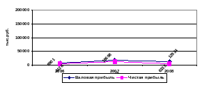 В 2007 г. на 110,1% по сравнению с 2006 г. увеличилась валовая прибыль и составила 18 698 тыс.руб., чистая же прибыль увеличилась на 211,5%. В 2008 г. валовая прибыль увеличилась по сравнению с базисным годом на 45,3%, чистая прибыль на 53,5%.