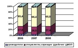 Структура персонала на протяжении анализируемого периода значительных изменений не претерпевала. В структуре преобладают рабочие (65,5% в 2007 г.); доля специалистов и служащих составляет около 27%; доля руководителей уменьшилась с 4,9 % в 2005 г. до 4,4% в 2007 г., что связано с увеличением общей численности персонала; доля младшего обслуживающего персонала увеличилась с 1,9% в 2005 г. до 2,7% в 2007 г.