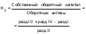 Коэффициент обеспеченности собственными оборотными средствами (К2) на конец отчетного периода рассчитывается по формуле (1.2) как отношение суммы итогов разделов III и IV пассива баланса за вычетом итога раздела I актива баланса к итогу раздела II актива баланса [20]: