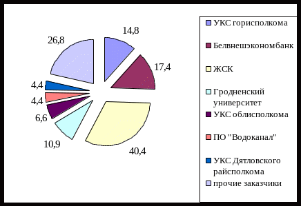 В 2004г. СУ №151 выполнено строительно-монтажных работ по генподряду на сумму 10491328 тыс. руб. и собственными силами на сумму - 5246658 тыс. руб. В числе наиболее крупных заказчиков строительно-монтажных работ в 2004г. были УКС горисполкома (14,8% от общего объема выполненных работ), ОАО «Белвнешэкономбанк» (17,4% от общего объема выполненных работ), жилищно-строительные кооперативы (40,4% от общего объема выполненных работ), УО «Гродненский государственный университет им. Я. Купалы» (10,9% от общего объема выполненных работ), УКС облисполкома (6,6% от общего объема выполненных работ), ПО «Водоканал» (4,4% от общего объема выполненных работ), УКС Дятловского райисполкома (4,4% от общего объема выполненных работ) и прочие заказчики (рис. 2.1.).